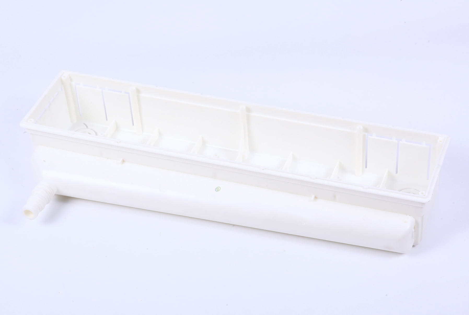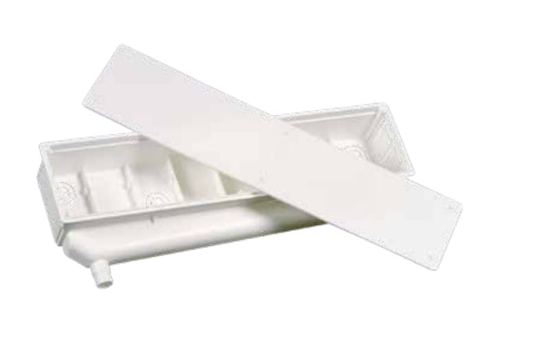 Podtynkowa skrzynka instalacyjna z tacą i pokrywą do ukrywania instalacji klimatyzacji w ścianie. Przenośnik kondensatu jest umieszczony wewnątrz i jest łatwy do sprawdzenia.