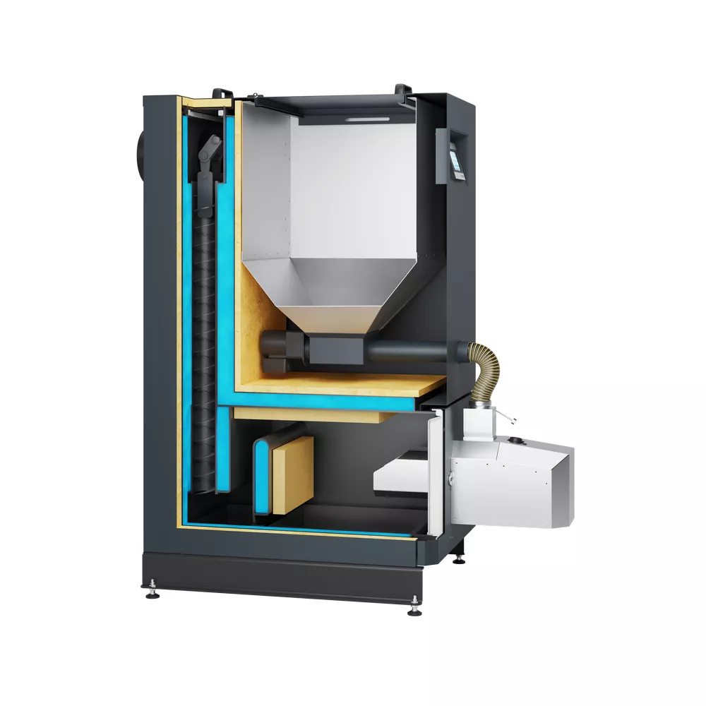 Kocioł Perfekt Bio na pellet Kompaktowy kocioł z wbudowanym zasobnikiem paliwa, wyposażony w samoczyszczący automatyczny palnik i prosty w obsłudze, stabilny w działaniu sterownik, stosowane biopaliwo - pellet 6-8 mm.