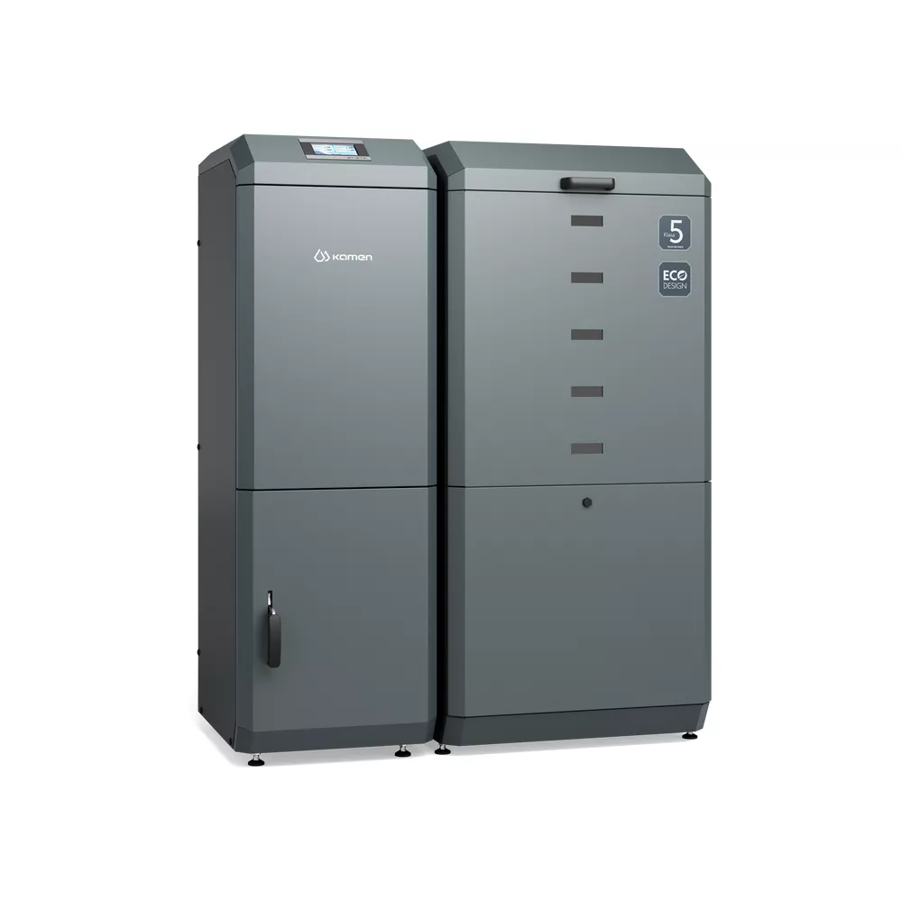 Kocioł pelletowy z automatycznym czyszczeniem palnika i wymiennika, o szerokim zakresie dostępnych mocy i ze sterownikiem obsługującym 4 obiegi grzewcze i 2 siłowniki.