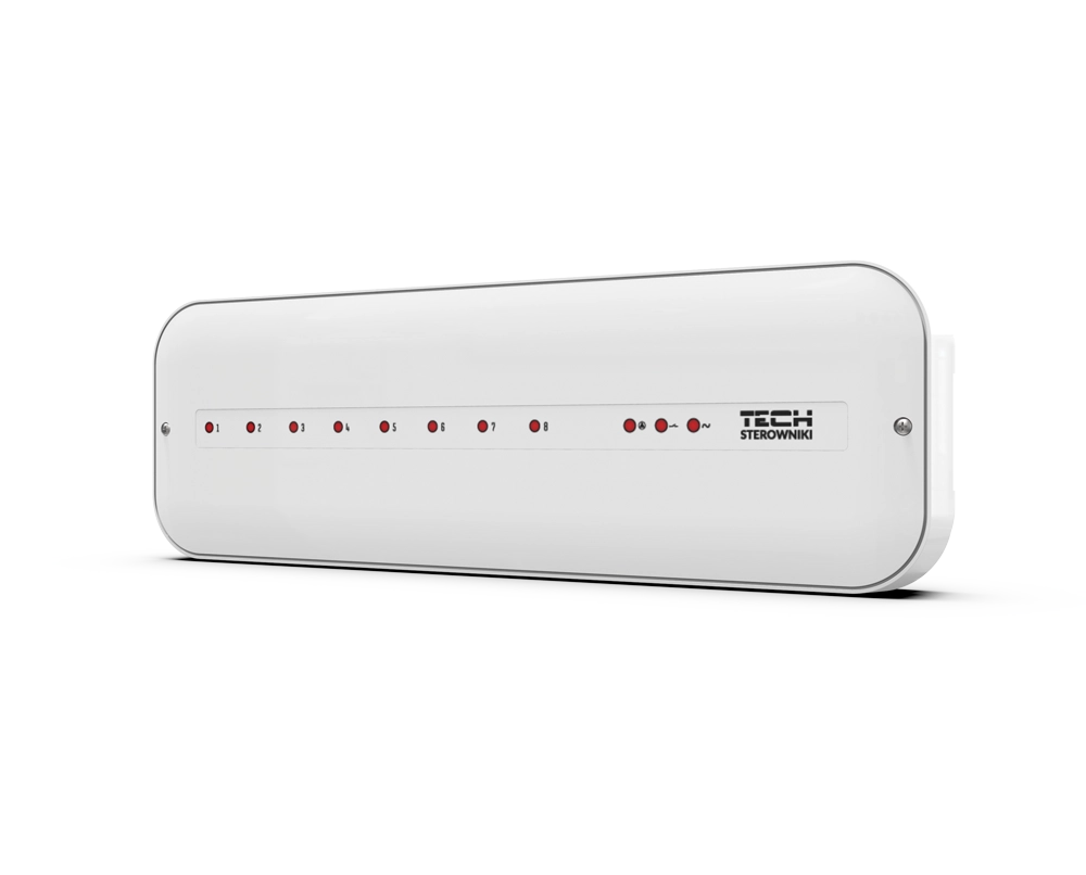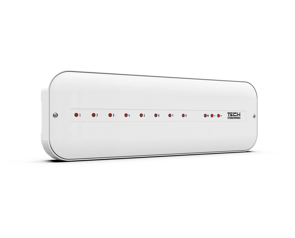 Przewodowy sterownik do podłogówki przeznaczony jest do zarządzania pracą siłowników elektrycznych na podstawie sygnału otrzymanego z regulatorów pokojowych. Kompletny zestaw urządzeń składający się z przewodowego sterownika do podłogówki, regulatorów oraz siłowników zapewni komfortową temperaturę w 8 strefach grzewczych. Urządzenie może obsłużyć maks. 50 siłowników elektrycznych przy pomocy 8 dwustanowych regulatorów pokojowych. Przewodowa listwa do podłogówki wyposażona jest także w styk beznapięciowy do zarządzania urządzeniem grzewczym.
