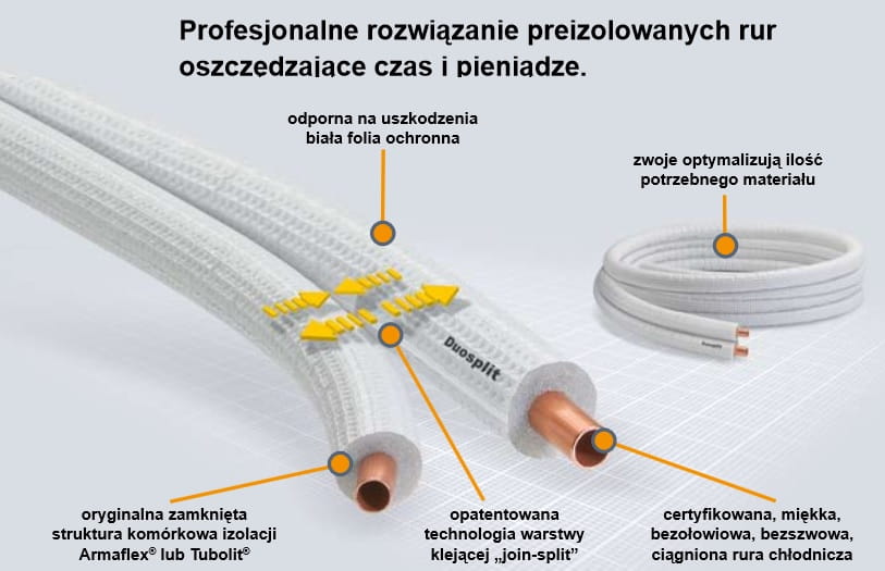 Tubolit Split/DuoSplit jest niezawodnym rozwiązaniem preziolowanych rur łączącym wewnętrzne i zewnętrzne jednostki klimatyzacyjne typu SPLIT i MULTI SPLIT. Certyfikowana, bezszwowa miedziana rura chłodnicza, zgodna z normą EN 12735-1, preizolowana jest oryginalnym materiałem izolacyjnym Tubolit.
