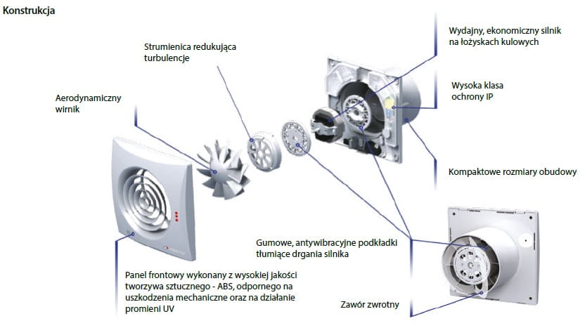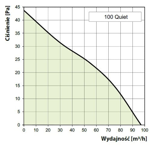 WENTYLATOR Ścienno-sufitowy VENTS 100 QUIET STANDARD GŁÓWNE CECHY: Średnica króćca: 99 mm (DO KANAŁU 100 mm) Wydajność: MAX 97 m³/h Pobór prądu: TYLKO 7,5 W Głośność: 25 dB(A) / 3 m Zawór zwrotny w standardzie ANTYWIBRACYJNE MOCOWANIE SILNIKA AERODYNAMICZNE ŁOPATKI WIRNIKA (ŚMIGŁA) ŁOŻYSKA KULOWE W STANDARDZIE STEROWANIE ręczne za pomocą naściennego włącznika światła. DANE TECHNICZNE i CHARAKTERYSTYKA PRZEPŁYWU: Znamionowe napięcie zasilania: 230 V Częstotliwość znamionowa: 50 Hz Moc: 7,5 W Wydatek powietrza: 97 m3/h Ciśnienie akustyczne: 25 dB(A)/3m Ciśnienie statyczne: 43 Pa Pobór prądu: 0,059 A Max. temperatura pracy: 40 °C Stopień ochrony: IP45 Waga: 0,55 kg MONTAŻ: Wentylator może być montowany bezpośredniow otworze kanału wentylacyjnego. W przypadku niewielkiej odległości od kanałuwentylacyjnego można zastosować kanały elastyczne.Kanał elastyczny należy podłączyć do króćcawentylatora za pomocą opaski zaciskowej. Wentylator może być mocowany do ściany zapomocą wkrętów. Wentylator może być montowany na suficie.