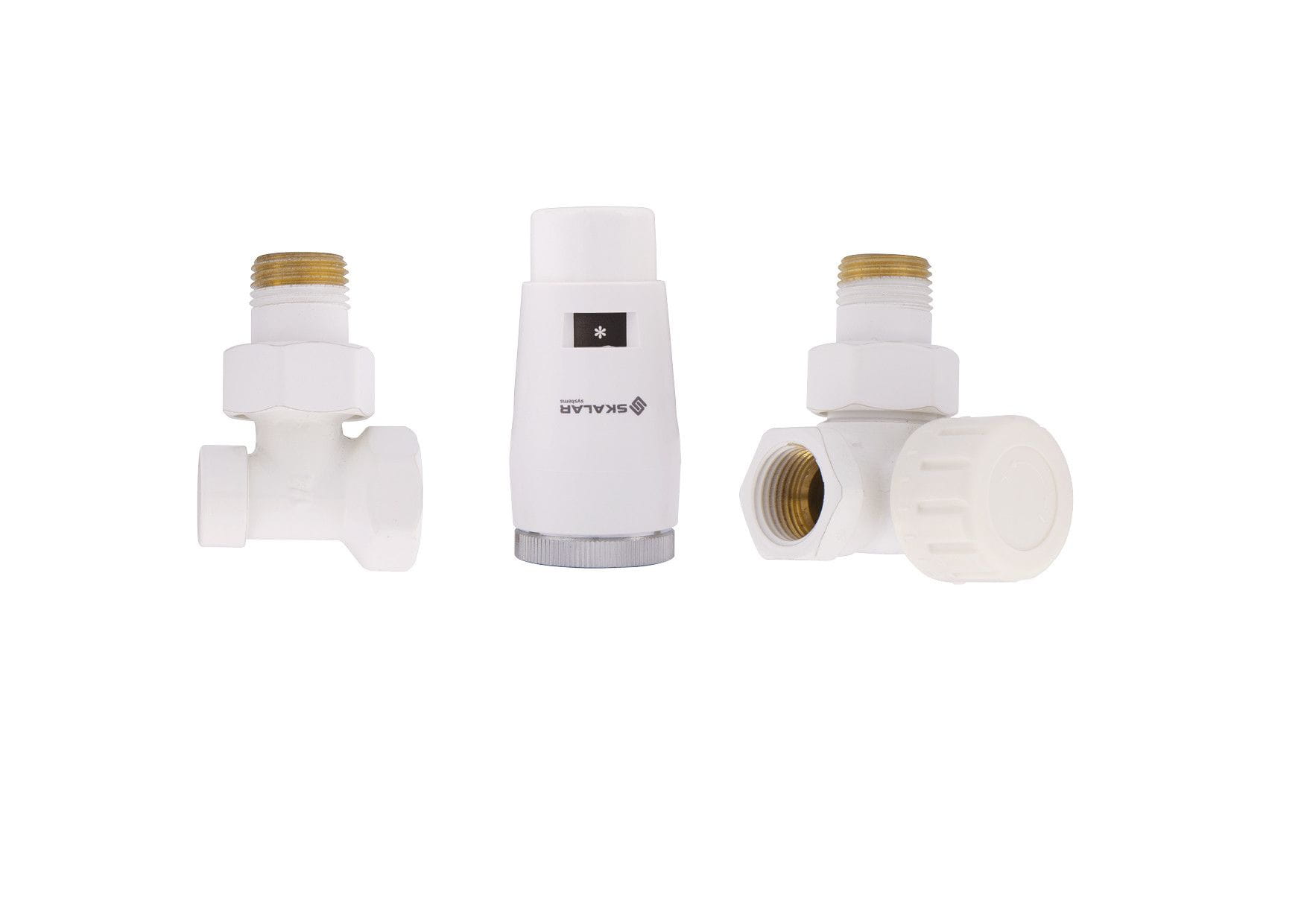 Zestaw łazienkowy osiowy-prawy-kątowy SKALAR do grzejników łazienkowych 1/2"x1/2" GZ x GW z głowicą SKALAR mini biały